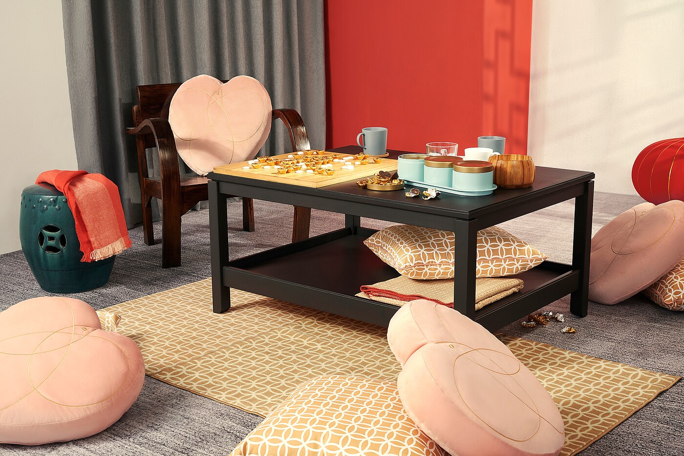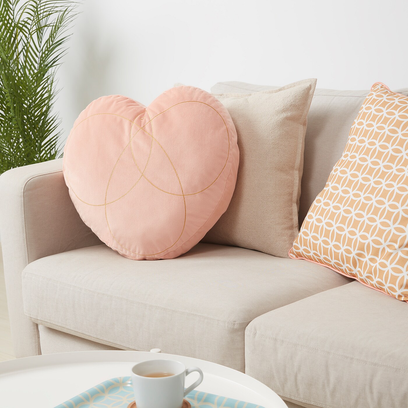 Đệm hình trái tim với bề mặt mịn như nhung - vừa thoải mái khi ôm hoặc tựa sau lưng. Hình thêu cá vàng là một biểu tượng được cho là mang lại sự giàu có.