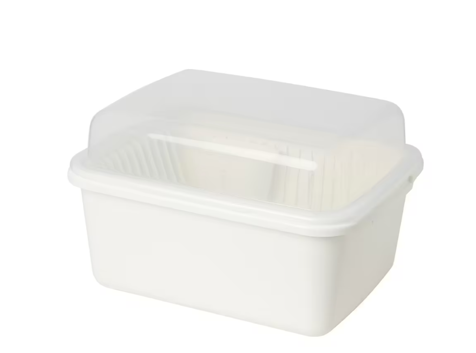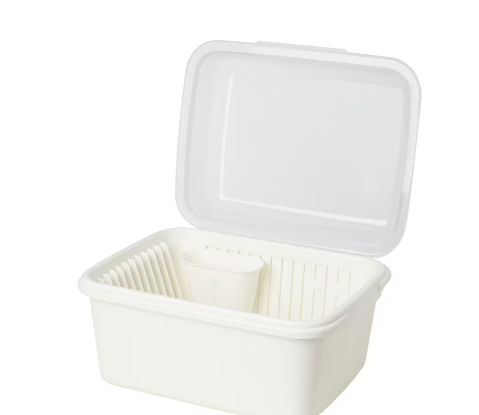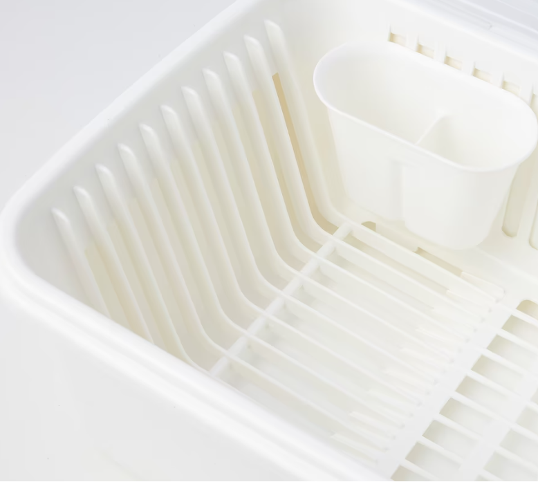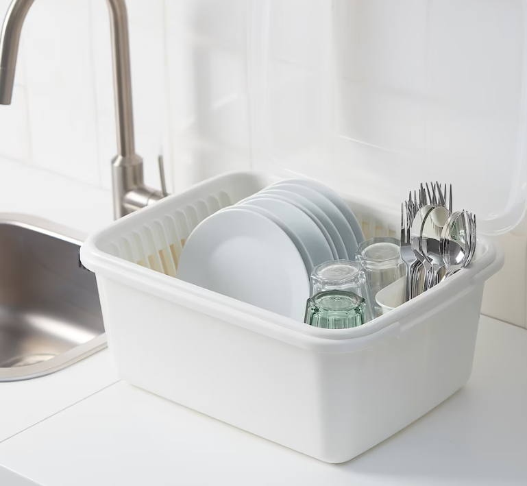 Trong khay đựng bát đĩa có nắp đậy này, bạn có thể vừa làm khô vừa đựng đĩa, bát và dao kéo. Một cách thông minh để tiết kiệm không gian trong các ngăn tủ, đồng thời giúp bàn làm việc trông gọn gàng hơn.